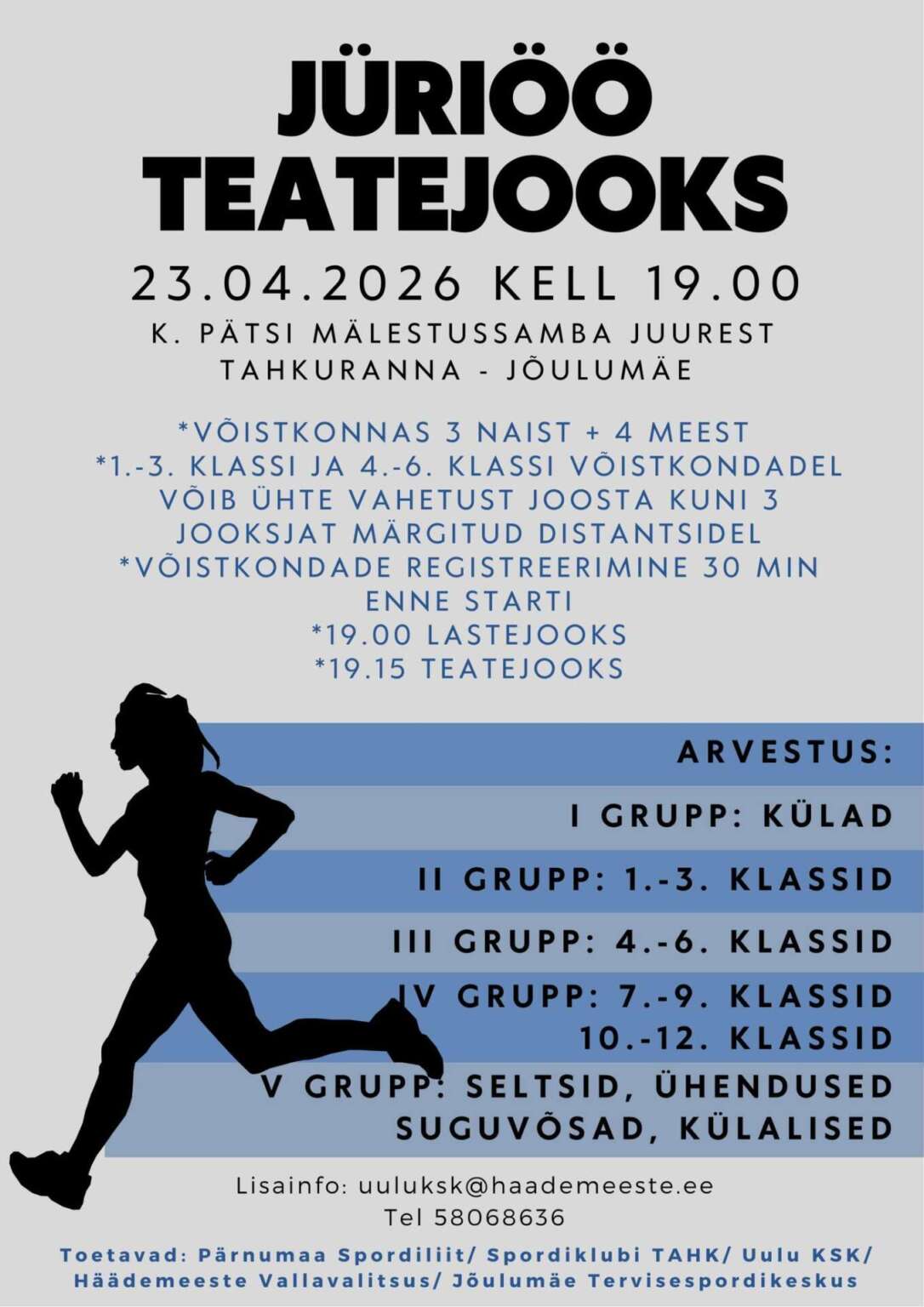 Tahkuranna–Jõulumäe Jüriöö teatejooks toimub kolmapäeval, 23. aprillil 2026.